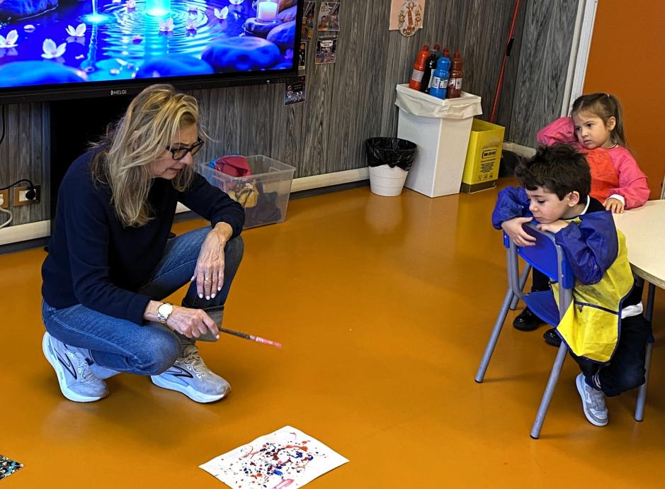 Cindy, an American artist visiting her grandchildren — two of our pupils — ran a workshop on Jackson Pollock’s action painting. The children painted with free, spontaneous movements, flinging and dripping paint, discovering that painting can also be about movement. Every piece of paper turned out different from the next. Thank you, Cindy, for sharing your work with us.
